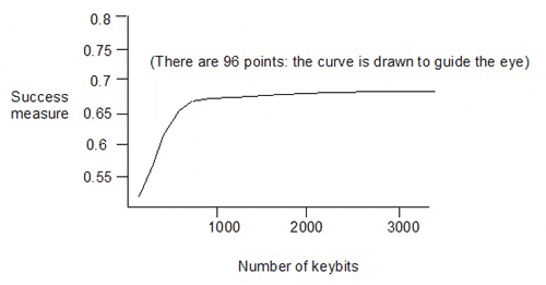 This gives the success measures for 96 keysets, with sizes from 100 to 3200 keybits, generated by eliminating descriptors from the 3234-bit keyset (in which each of the 3234 keybits corresponds to one of 3234 descriptors). The dependence of the success measure on the number of keybits is quite weak above about 1000 keybits in the keyset.