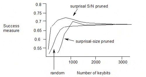 The published results of pruning the keybits from a keyset using surprisal or surprisal S/N ratio as the selection criterion are as follows:
