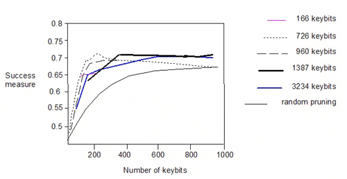 The authors also pruned the 166-, 726-, 960- and 1387-bit keysets and plotted the success measure against the number of keys: