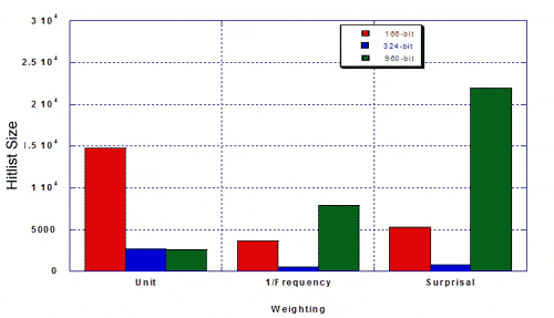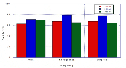 The authors were interested in the performance of the 324-keybit set compared to the 166- and 960-bit keysets from the standpoint of efficiency and relevance (i.e., does a weighted similarity search bring in a lot of hits, including irrelevant ones, or does it hit a select number of relevant structures). They measured hitlist size and percent MDDR structures of the given hitlist, using a 50% similarity search against 100 random query structures from MDDR, and using three types of weighting The resulting hitlist sizes for MDDR were as follows: